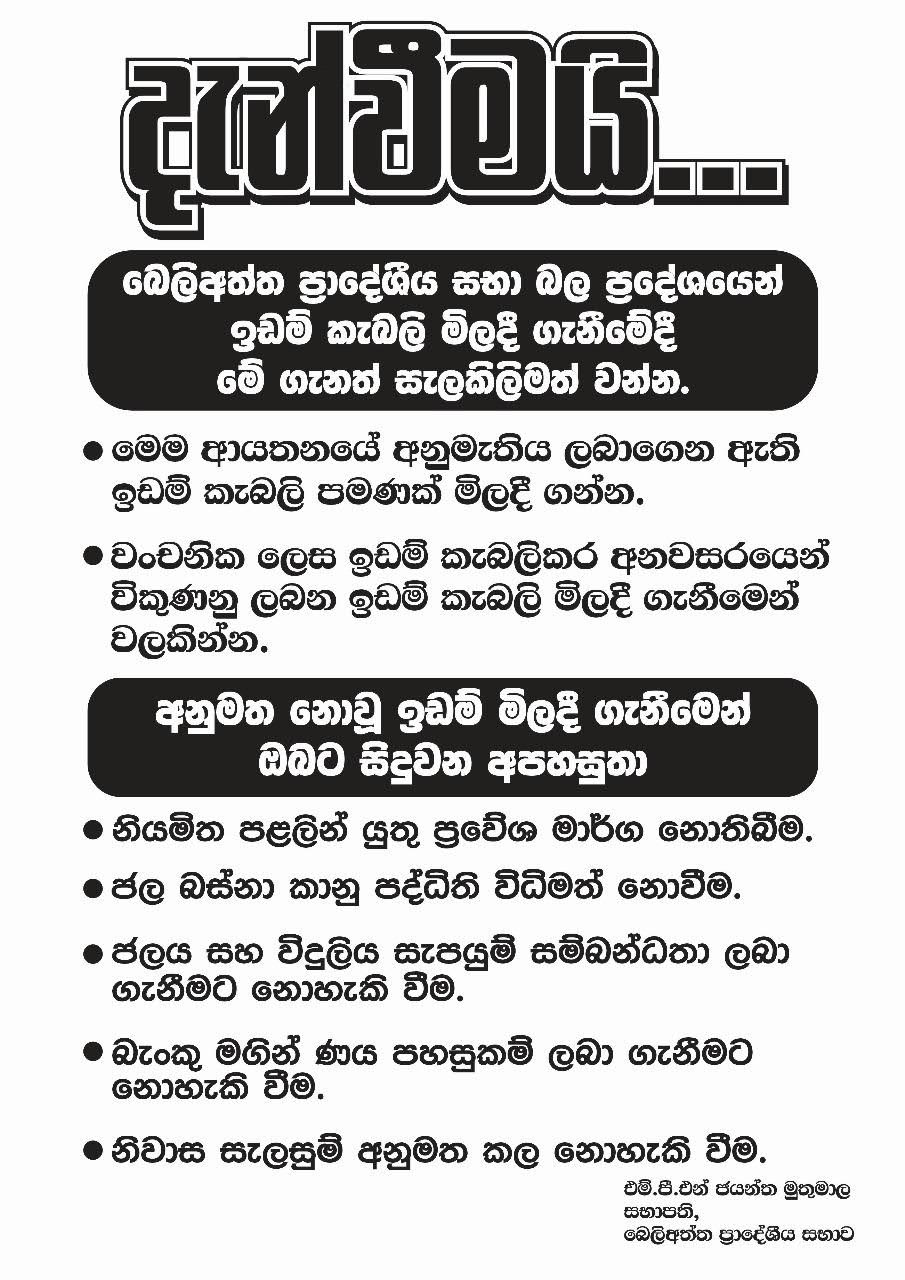 பெலியத்த பிரதேச சபைப் பகுதியில் காணித் துண்டுகளை வாங்கும் போது இதை மனதில் கொள்ளுங்கள்.
